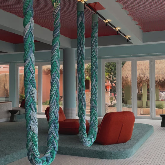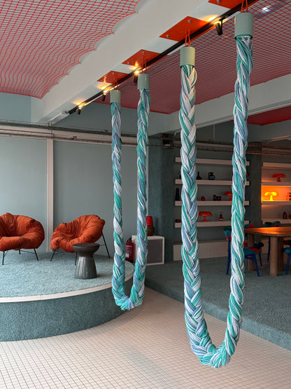 - Upcycled textile braid. Stainless Steel holding cups.
